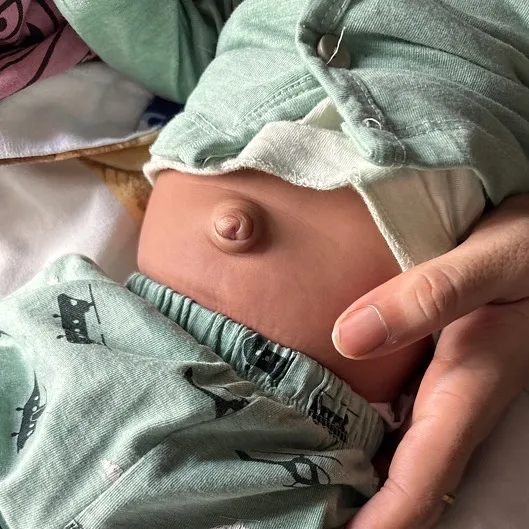 A. It is called umbilical hernia which most of the time gets alright on its own as the baby grow but it’s better to get it checked by your Paediatrician and apply Vaseline on the redness and give diaper free time to the baby